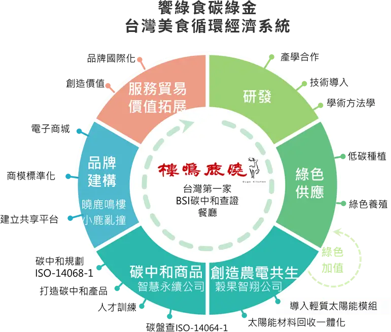 為了要達成國家2050淨零的目標,穀果國際也成立了智慧永續顧問公司,進行碳盤查與輔導服務,並且協助企業完成碳中和的國際認證,且將曉鹿鳴樓的經驗,完整的複製到餐飲服務業與其他產業,未來建立曉鹿鳴樓國際授權,將臺灣美食一條龍的智慧經驗複製到其他國家,從台灣出發,立足國際。